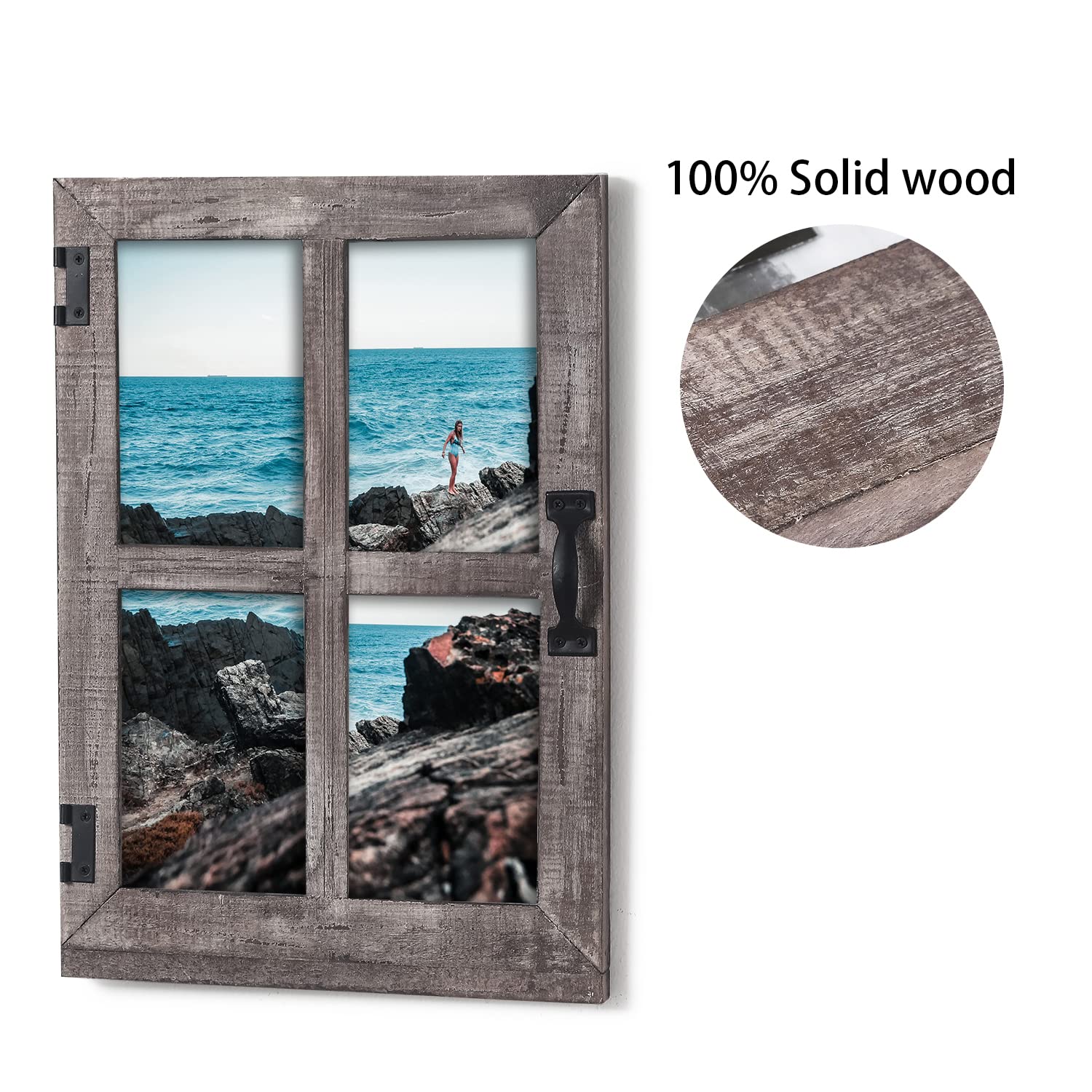 Adeco Rustic Farmhouse Window Pane Picture Frame for Four 4x6 Photos, Distressed Wood Collage Frame with Real Glass for Wall Decor, Rustic Grey